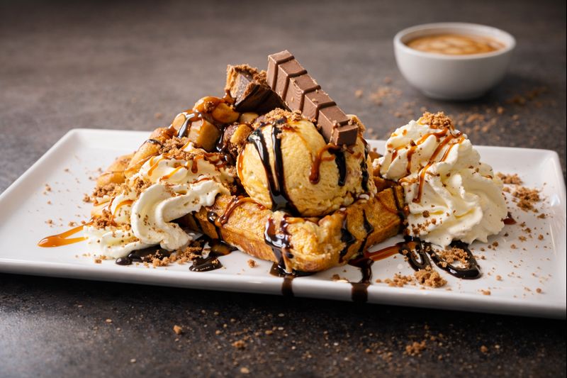 - Mood “dulce y contundente”: meriendas dulces tipo gofres/crepes/waffles como concepto + combinaciones según carta.